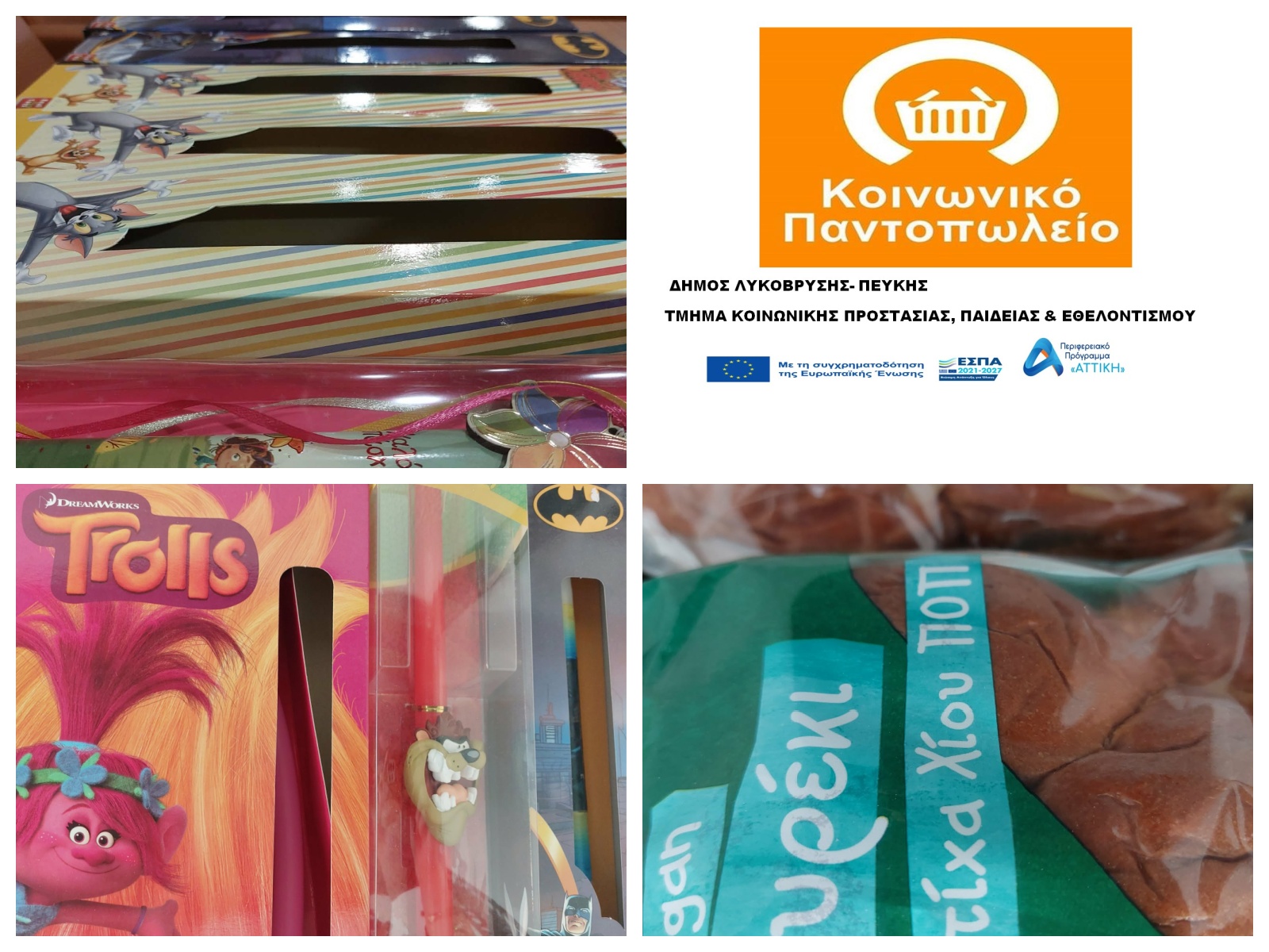 Πραγματοποιήθηκε, στις 6 Απριλίου, από το Κοινωνικό Παντοπωλείο του Δήμου Λυκόβρυσης-Πεύκης η διανομή προϊόντων για τον μήνα Απρίλιο, στην οποία εξυπηρετήθηκαν συνολικά 94 οικογένειες, στα εξής προϊόντα: ζάχαρη, αλεύρι, ντοματοχυμό, όσπρια, ρύζι, ζυμαρικά, ψωμί του τοστ, ελαιόλαδο, αραβοσιτέλαιο, κάψουλες πλυντηρίου, αλάτι, μαρμελάδα, ξύδι, καθαριστικά, χαρτί υγείας, χαρτοπετσέτες, μπισκότα, χυμούς, πάνες βρεφικές, βρεφικό γάλα και κρέμες, μωρομάντηλα και υποσέντονα. Δόθηκαν επίσης τσουρέκια και λαμπάδες, εν όψει του Πάσχα.